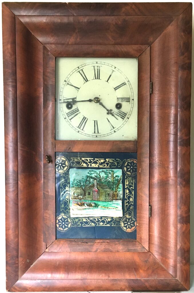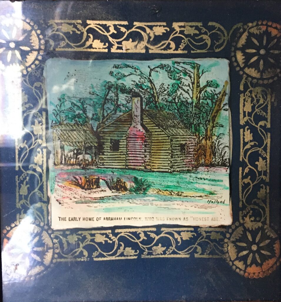 Tablet depicting the log cabin of Abraham Lincoln’s childhood. Note that this clock was made within a couple of years of Lincoln’s assassination in April 1865.