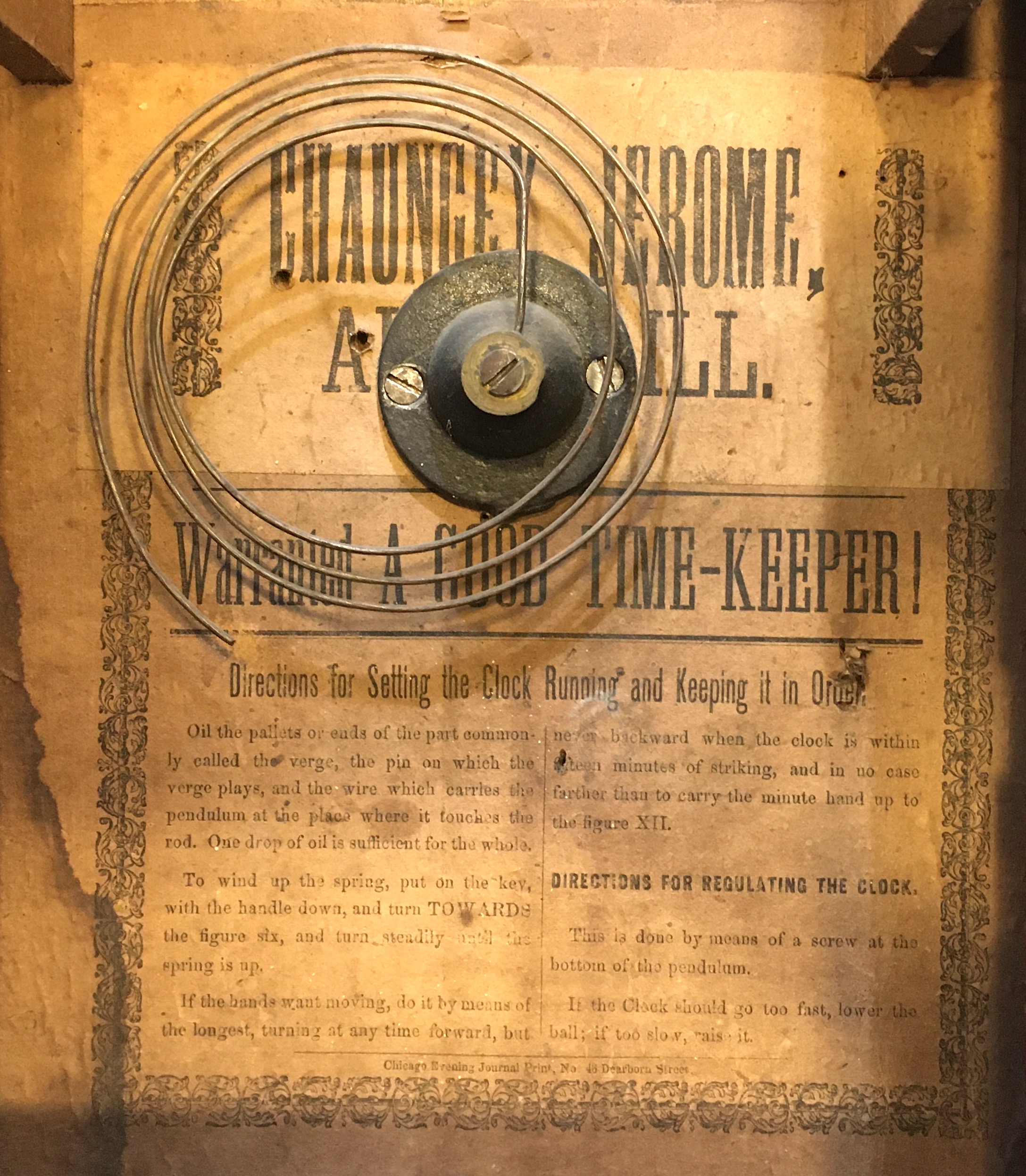 Label identifying Chauncey Jerome as the maker and giving his location as Austin, IL. Clocks with US C&B Co. labels give the location as Chicago. At the time, Austin was on the far outskirts of Chicago. The company had a retail shop in Chicago owned by one of the partners of the clock company.